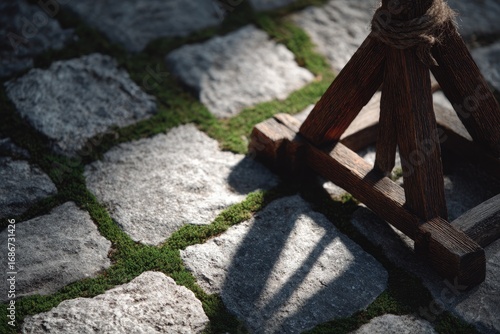 Cobblestone path with moss and shadow of a wooden structure.
