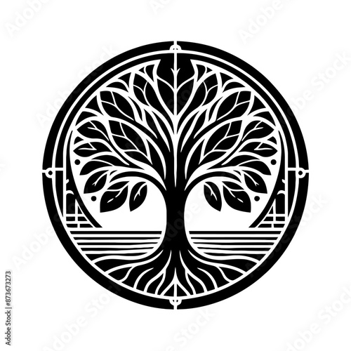 Cocoa plant, tree in decorative emblem ornament, Victorian, art deco, art nouveau, boho, bohemian, folk, flourish