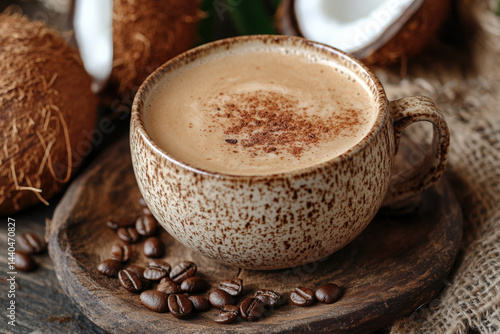 Coconut Milk Latte with Coffee Beans. A rustic cup of coconut milk latte with coffee beans. A close-up showcases the creamy texture and warm tones.