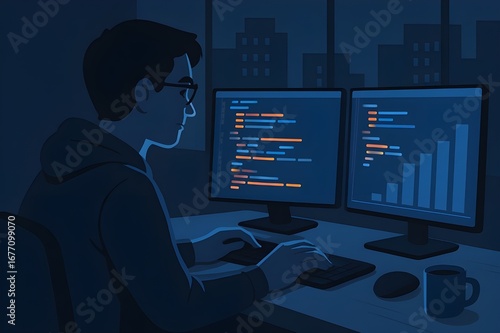 Code Composer: A programmer engrossed in coding on a dual-monitor setup late into the night, illustrating dedication and technological expertise.