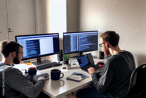 coders working, big displays with datd flow, illustration