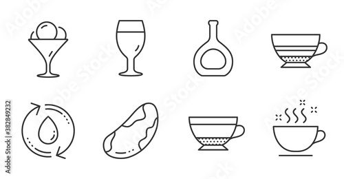 Coffee cup, Beer glass and Brazil nut line icons set. Dry cappuccino, Refill water and Mocha signs. Ice cream, Cognac bottle symbols. Hot drink, Brewery beverage, Vegetarian. Vector