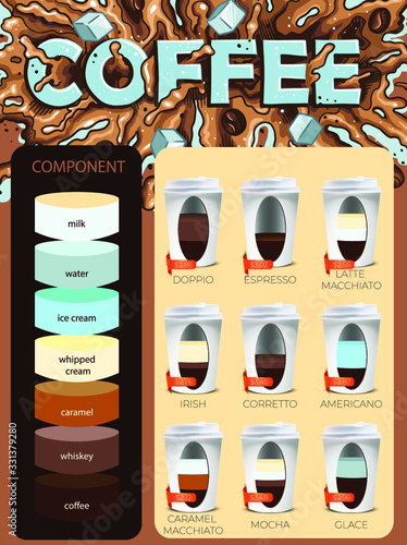 coffee menu, ingredients and proportions set coffee in a glass, coffee components and the price of different varieties Vector illustration