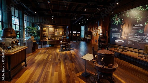 coffee museum exhibiting historical artifacts and interactive displays about the evolution of coffee bean processing against a backdrop of polished wooden floors and displays.