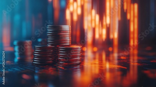Coin stacks with a digital financial graph in the background, symbolizing economy trends, financial meltdown, and cryptocurrency market dynamics
