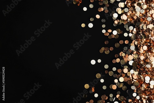 Coins cascade downwards against a solid black backdrop, creating a beautiful contrast with their shiny surfaces. The variety of shapes and sizes adds visual interest to the scene.