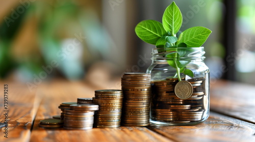 Coins stacked with a plant growing, symbolizing investment growth and financial sustainability.