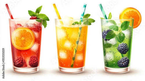 Cold summer beverage in glass with straw made of lemon, orange and berries, green mint leaves and ice cubes. Cartoon vector illustration set of cocktail and juice drinks with slice of fresh fruits.