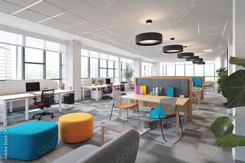 collaborative open office space with flexible workstations, comfortable seating, natural light, and vibrant pops of color - Generative AI
