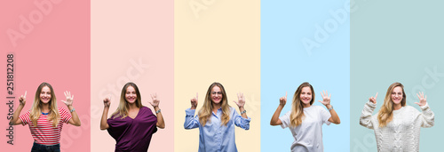 Collage of beautiful young woman over colorful stripes isolated background showing and pointing up with fingers number six while smiling confident and happy.