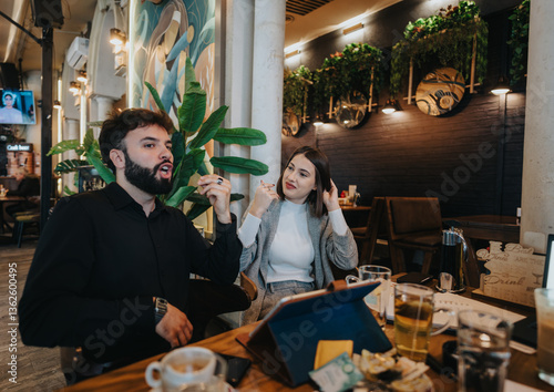 Colleagues engage in a lively conversation while connected digitally in a trendy cafe. The atmosphere is casual yet professional, reflecting modern work and social interactions in a relaxed setting.