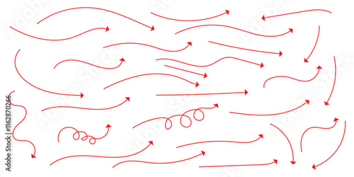 Collection hand drawn arrows. Set simple curved arrows isolated on white background. Collection of pointers. Vector illustration. Red hand drawn curve arrow icon vector set.