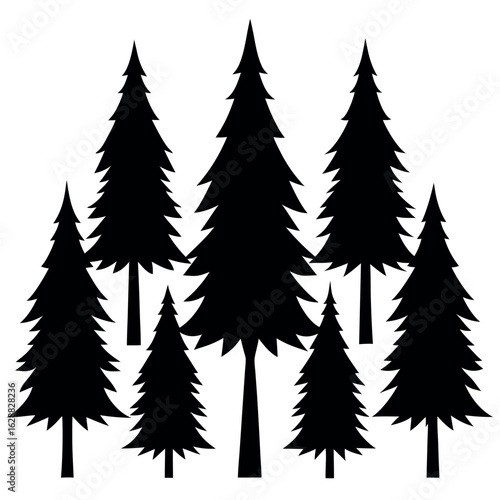 Collection of 10 pine tree silhouettes with spiked edges isolated on white background silhouette