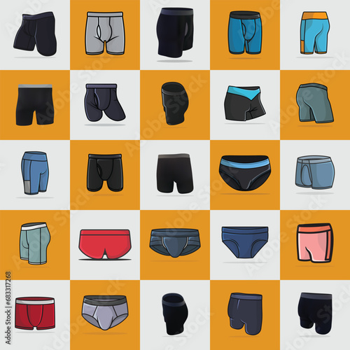 Collection Of 25 Boys Sports Comfortable Underwear Shorts vector illustration. Sports and fashion objects icon concept. Men сolored boxer shorts and Pant vector design with shadow.