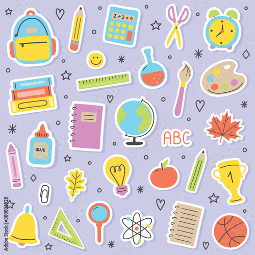 Collection of a hand drawn school icons. Colourful stationery stickers. Vector illustration