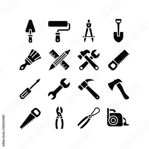 Collection of black and white construction tools icon set