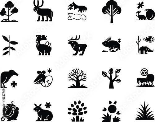 Collection of Black and White Iconography Featuring Animals and Plants Isolated on a Clean White Background