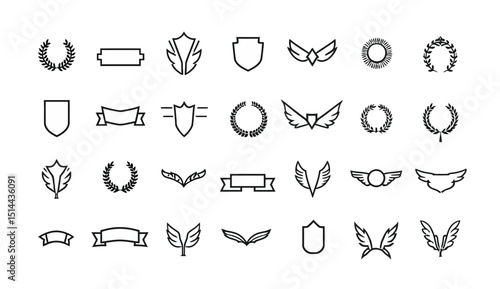 Collection of Black and White Line Art Heraldic Elements: Shields, Wreaths, Ribbons, Wings.