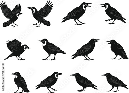 Collection of black crow and raven bird silhouettes in flying, standing, and calling poses isolated on white background vector illustration design.