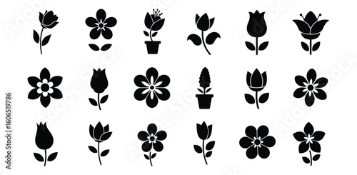Collection of black flower icons on white background in vector format