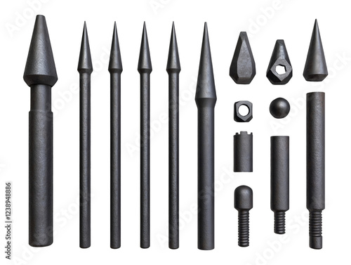 Collection of black metal industrial tools and spare parts arranged neatly isolated on transparent background, PNG, cut out