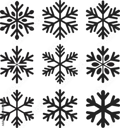 Collection of black minimalist snowflake icons against a clean white background for winter decoration