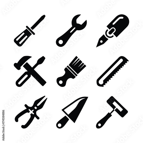 Collection of black silhouette icons of various hand tools on white background vector