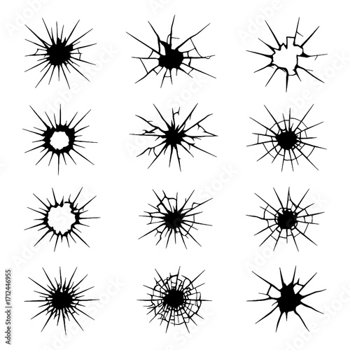 Collection of bullet hole and shattered glass symbols in bold black silhouette graphic style, Transparent Background