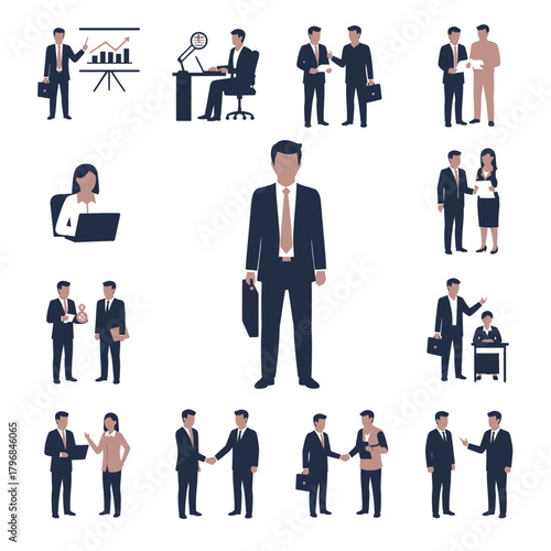 Collection of business professional figures in various poses and situations, like meetings and presentations
