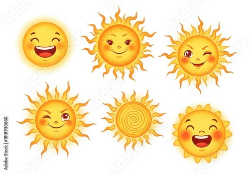 Collection of cartoon suns with different expressions isolated on white background