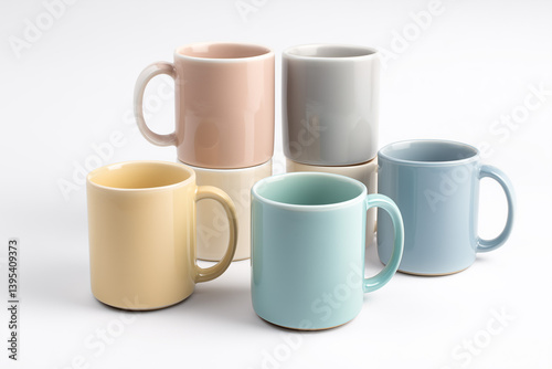 Collection of colorful ceramic mugs stacked in an artistic arrangement on a white background