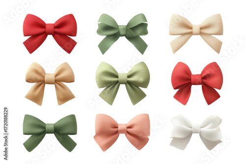 Collection of colorful fabric bows in various shapes and textures on black background, cut out