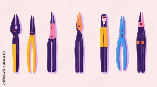 Collection of colorful pliers arranged in a line showcasing different styles and designs on a soft background