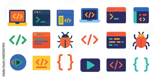 Collection of computer icons, including a bug, a computer monitor, and a keyboard. The icons are all colorful and stylized, giving the impression of a fun and playful atmosphere