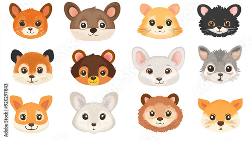 Collection of cute cartoon animal faces on white background