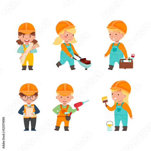 Collection of cute little builders in overalls and safety hats working with construction tools cartoon vector illustration