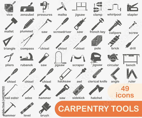 Collection of dark full icons of carpentry tools. Tool for a carpentry workshop with the name. Vector illustration.