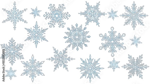 Collection of detailed blue and white snowflakes on a white background winter cold