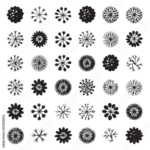 Collection of diverse black silhouettes of stylized flowers and plants viewed from above