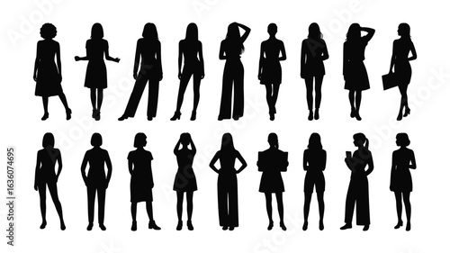 Collection of Diverse Female Silhouettes in Various Poses and Attire on White Background woman people