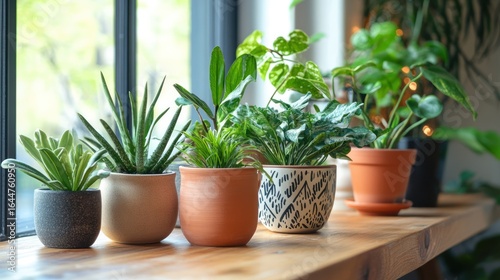 Collection of Diverse Potted Plants Displayed on Wooden Shelf by the Window