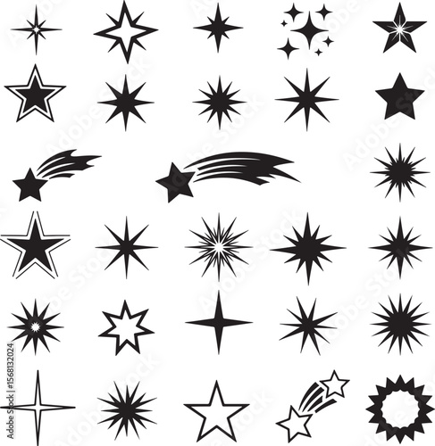 Collection of Diverse Star Shapes and Shooting Stars starburst sparkle