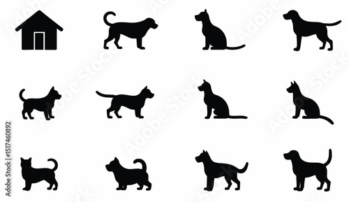 Collection of dog silhouettes in various poses with a kennel icon on white.