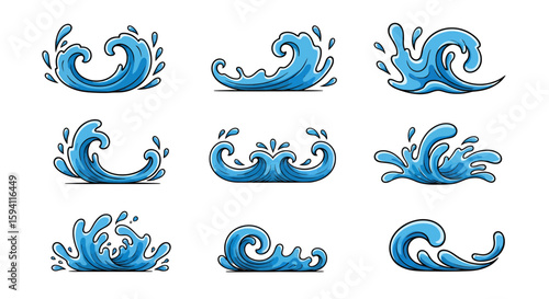 Collection of dynamic and stylized blue water splashes and ocean waves, perfect for graphic design projects and illustrations.
