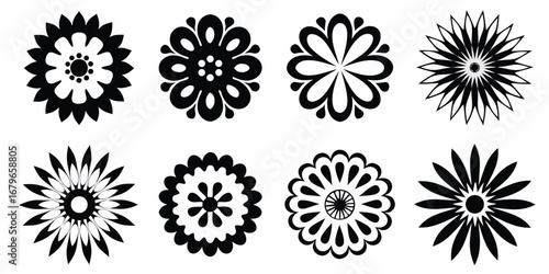 Collection of eight stylized black and white floral silhouettes on a white background
