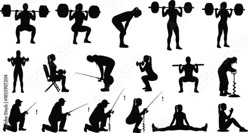 Collection of fitness workout silhouettes and ice fishing hobby silhouettes including weightlifting squats and people fishing on a white background