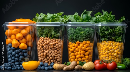 Collection of four glass containers filled with various fruits and vegetables. The containers are arranged in a row, with each one containing a different assortment of produce