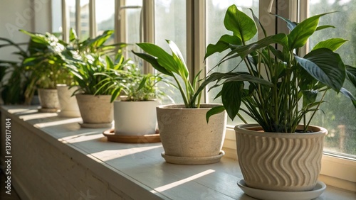 Collection of green houseplants in ceramic pots arranged on shelf near sunlit window indoor gardening vibes fresh