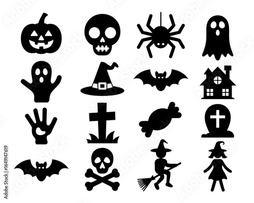 Collection of halloween icons including pumpkin ghost skull bat witch and more isolated on white background silhouette