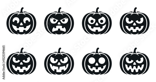 Collection of Halloween Pumpkin Faces with Various Expressions Spooky Angry Happy and Mischievous all in Black and White Isolated on a White Background